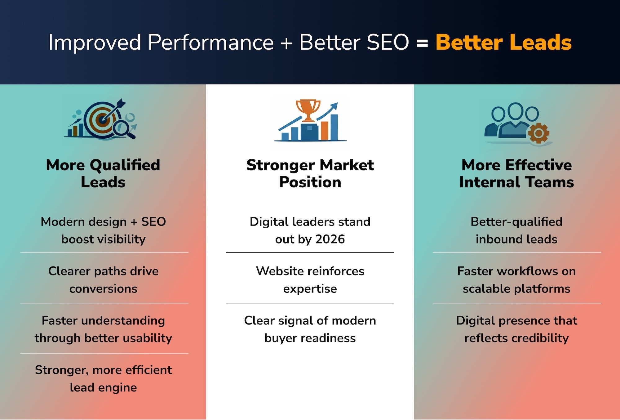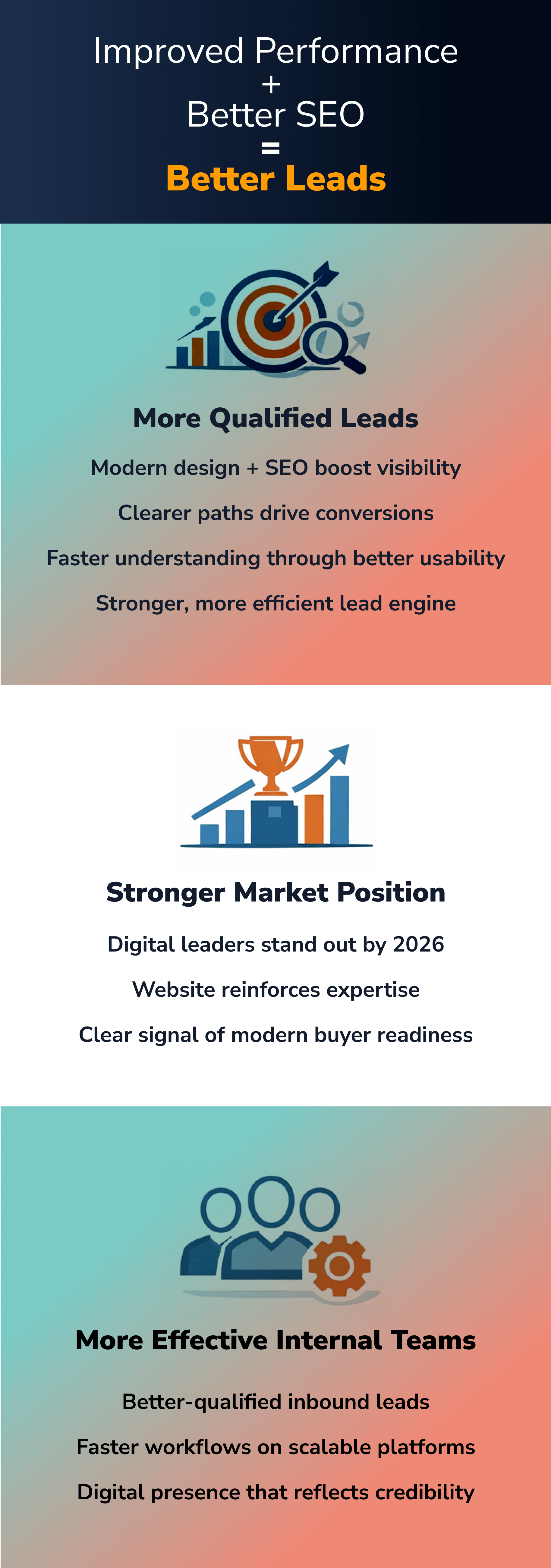 An SEO-focused, well-structured website differentiates your business, builds buyer confidence, and attracts higher-quality prospects. It forms the foundation for sustainable growth by aligning performance, design, and user experience.