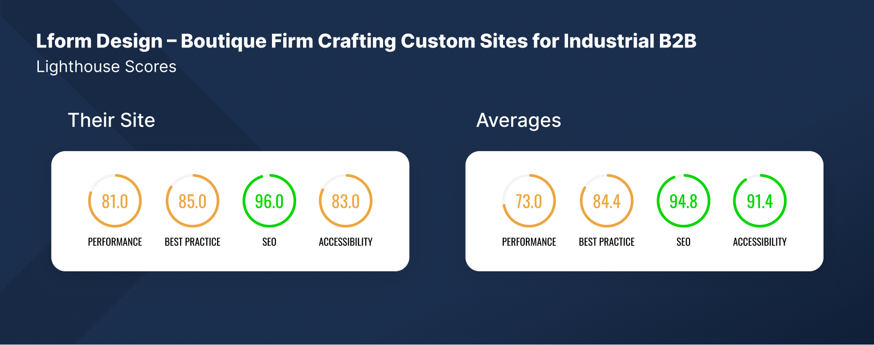 Lform’s sites score very well on best practices and SEO, hitting the mid-90s., aligning with their approach to coding and optimization. Accessibility is in the mid-80s on average and performance averages around 73. In practice, their attention to clean code and image optimization means most Lform sites feel snappy for users despite the rich content provided.