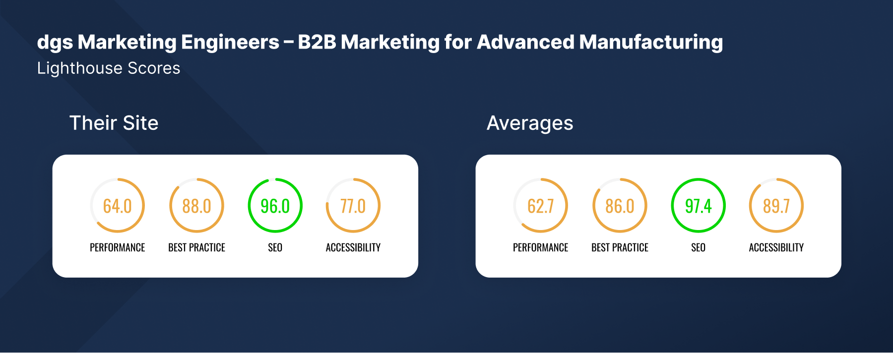 After running Lighthouse audits on sample manufacturing sites from each of these agencies and for their business site, some clear patterns emerged. Nearly all deliver strong SEO and accessibility, most sites scored in the high 90s for SEO and did well on Accessibility, showing that top agencies know how to make sites both findable and usable for all.