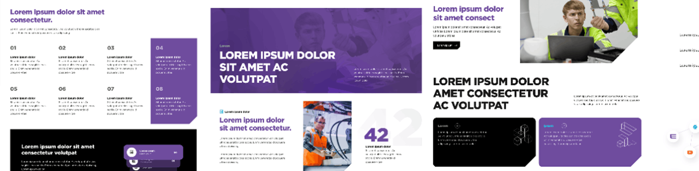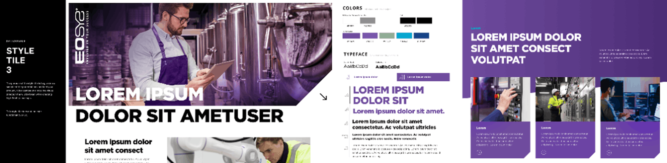 Brand colors, clean gradients, and industry images create a look that is technical and approachable. Clear typography and repeatable patterns make complex solutions easy to understand.